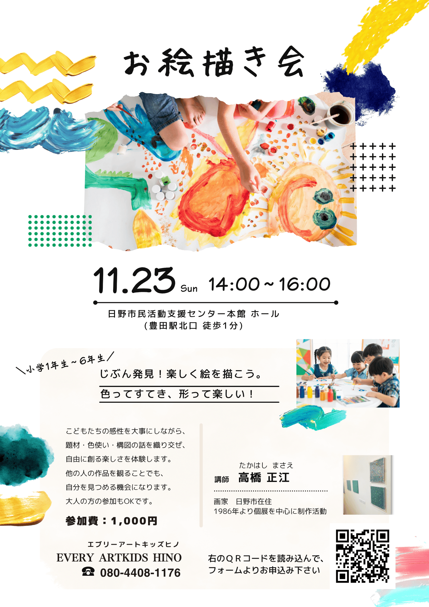 | その他 | 染料が飛び散ることがあります。汚れてもいい服でお越しください。 ポスターはこちら(エブリーアートキッズ 画像)。 お問合せは、メール:kukopo@gmail.com お電話:080-4408-1176 まで。 |